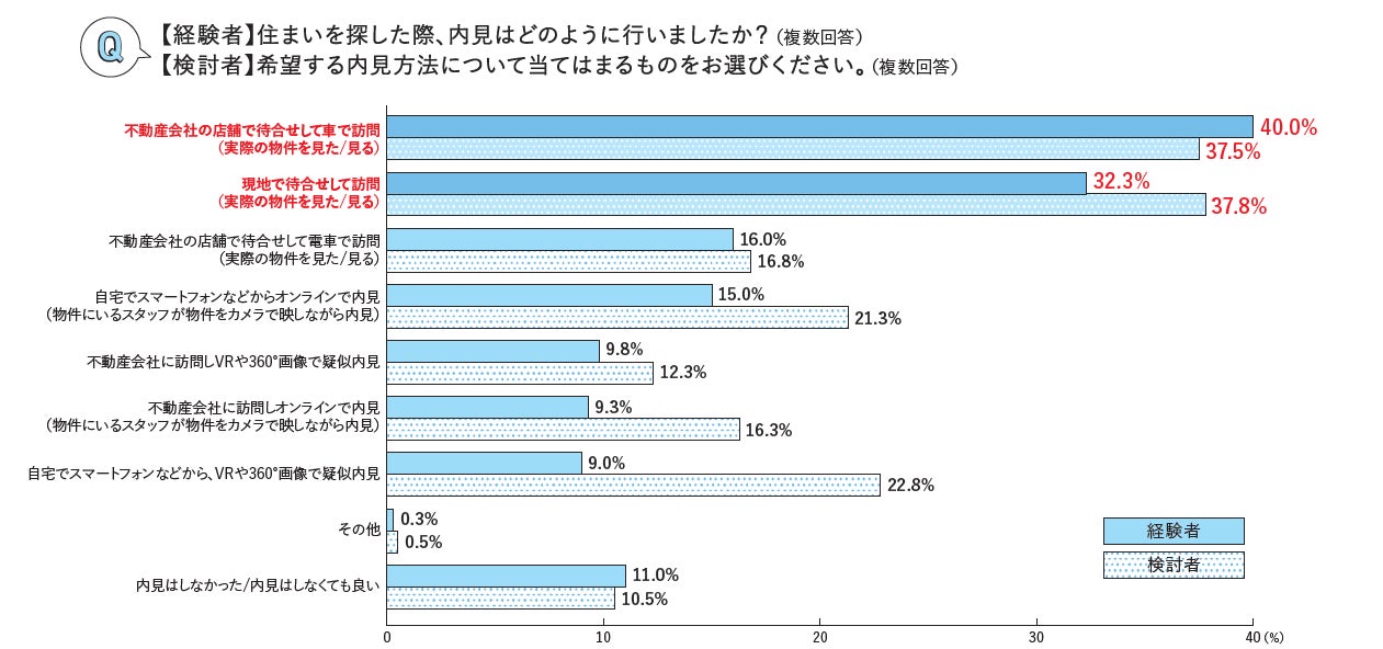 内見方法については、経験者は「不動産会社の店舗で待合せして車で訪問」、検討者は「現地で待合せして訪問」がトップでした。また、「内見はしなかった/内見はしなくても良い」が1割以上いることから、インターネットの情報だけで十分と考えている人もいるようです。