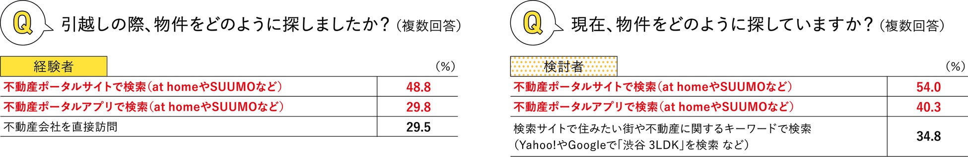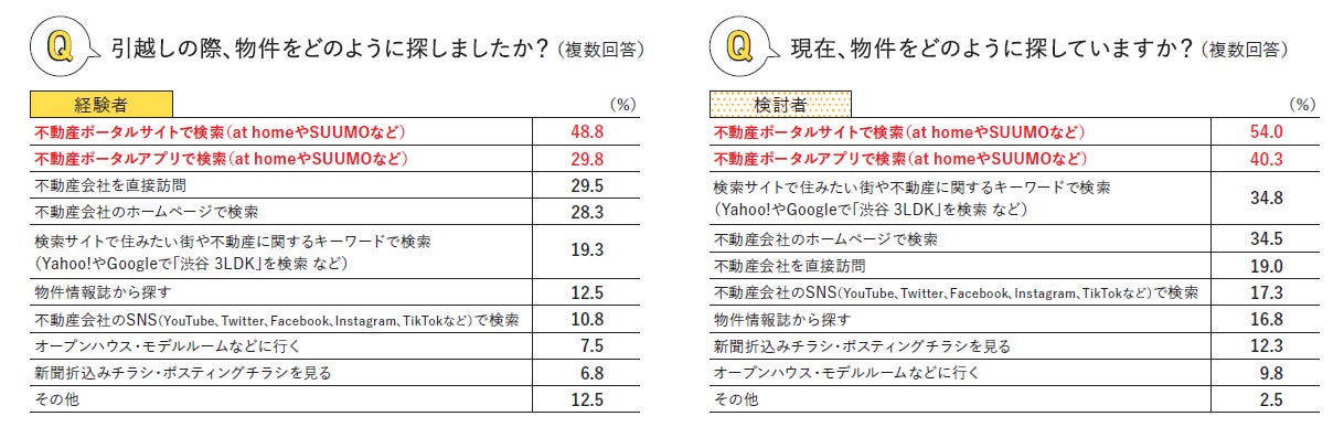 物件の探し方を聞いたところ、経験者は48.8%、検討者は54.0%が「不動産ポータルサイトで検索」と回答しました。さらに、経験者・検討者ともに「不動産ポータルアプリで検索」が続きました。また、「不動産会社のホームページで検索」がいずれも約3割、「不動産会社のSNSで検索」が1割以上いることから、不動産会社の公式サイトやSNS の充実も求められるようです。