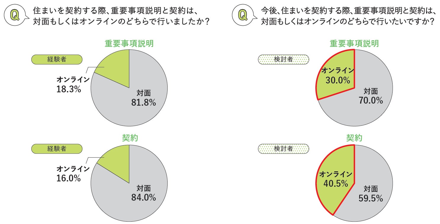 重説・契約は「オンライン」を経験したのは2割未満に対し、検討者の3割以上が希望しました。訪問や記入の手間を減らしたいというニーズがあるようです。また、2022年5月の宅地建物取引業法により、今後さらにオンライン化が進むことが予想されます。