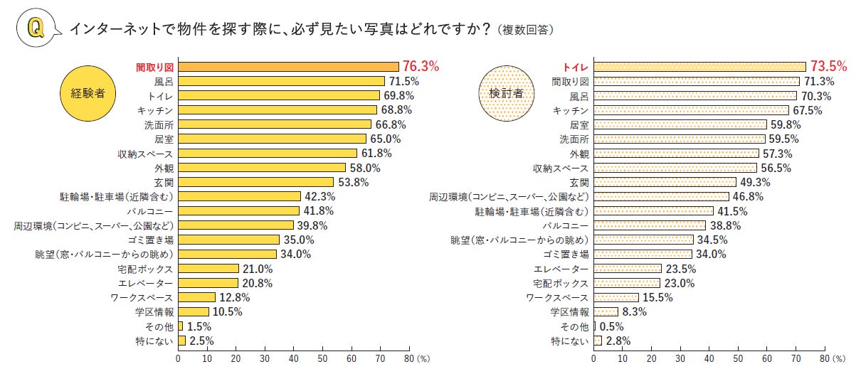インターネットで物件を探す際に必ず見たい写真について、経験者の76.3%が「間取り図」、検討者の73.5%が「トイレ」と回答しました。「トイレ」と回答した人は、きれいさや広さ、温水洗浄便座かどうかを確認したいという声が上がりました。