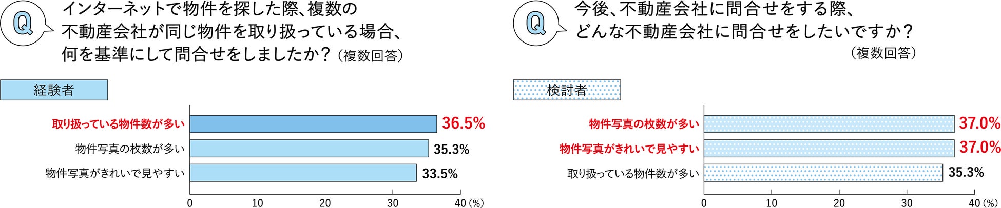 複数の不動産会社が同じ物件を取り扱っている場合の問合せ基準を聞くと、経験者は「取り扱っている物件数が多い」がトップ。一方、検討者は「物件写真の枚数が多い」「物件写真がきれいで見やすい」が最多で、「写真」を重視する人が多いようです。
