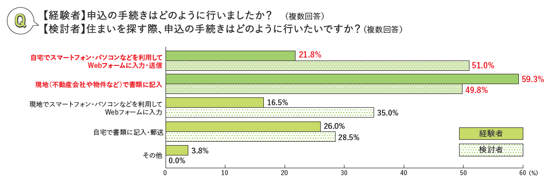 検討者の半数以上が入居申込方法について「自宅でWebフォームに入力」を希望しました。一方で「現地で書類に記入」の希望も多いことから、いずれの方法にも対応できることが求められているようです。