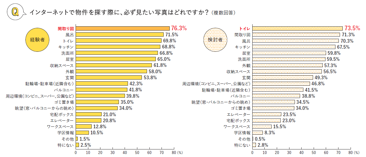 インターネットで物件を探す際に必ず見たい写真について、経験者の76.3%が「間取り図」、検討者の73.5%が「トイレ」と回答しました。「トイレ」と回答した人は、きれいさや広さ、温水洗浄便座かどうかを確認したいという声が上がりました。