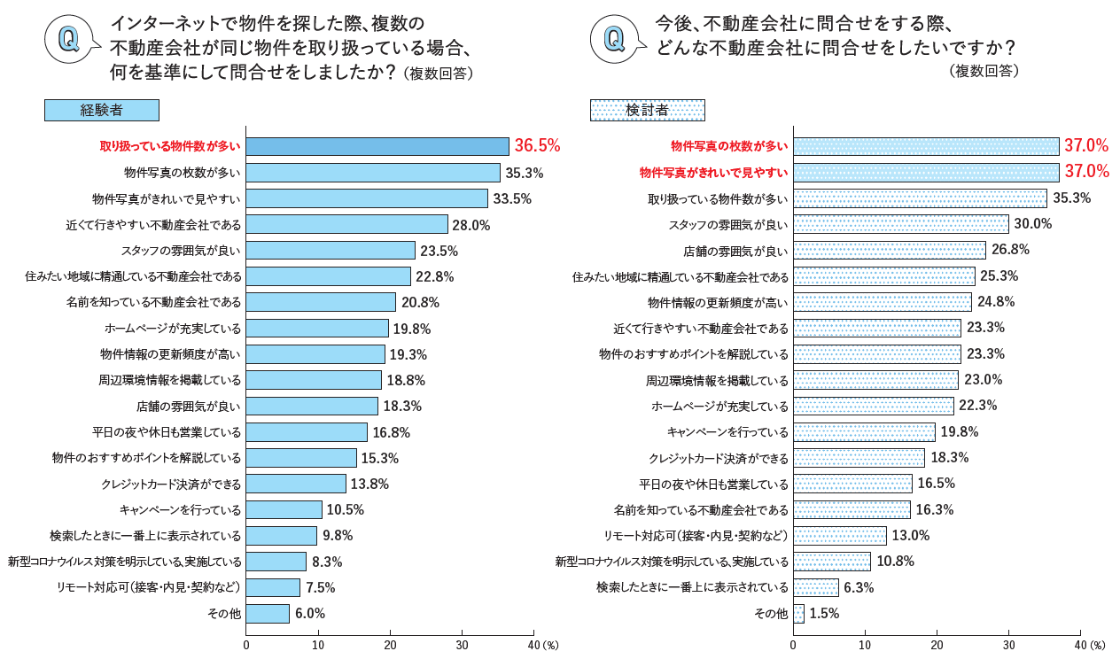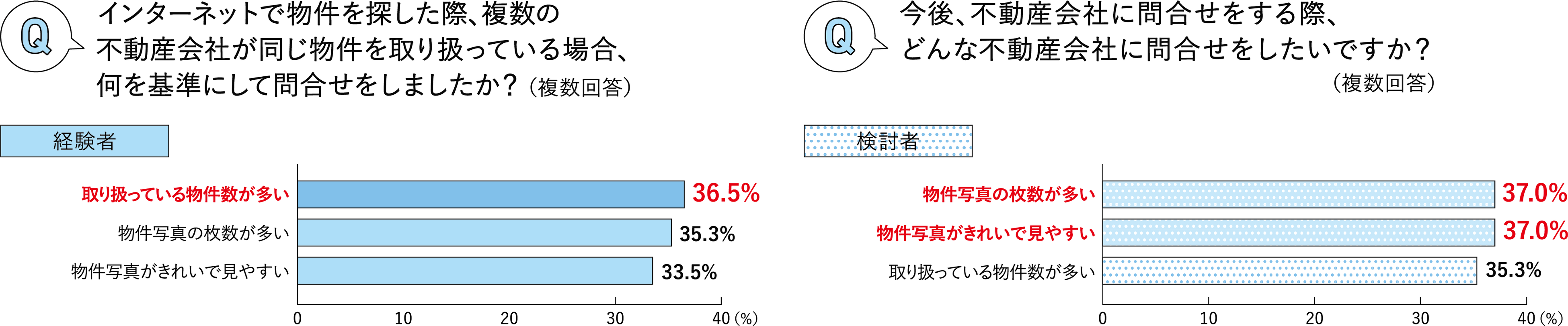複数の不動産会社が同じ物件を取り扱っている場合の問合せ基準を聞くと、経験者は「取り扱っている物件数が多い」がトップ。一方、検討者は「物件写真の枚数が多い」「物件写真がきれいで見やすい」が最多で、「写真」を重視する人が多いようです。