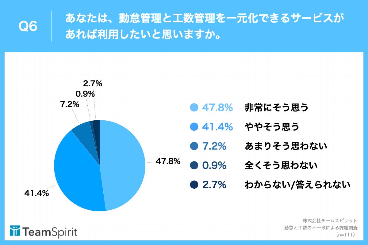 「Q6.あなたは、勤怠管理と工数管理を一元化できるサービスがあれば利用したいと思いますか。」(n=111)と質問したところ、「非常にそう思う」が47.8%、「ややそう思う」が41.4%となり約9割が勤怠管理と工数管理を一元化できるサービスに関心を示す結果となりました。