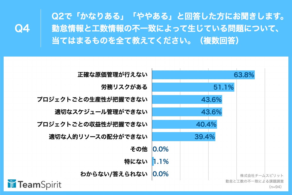 Q2で「かなりある」「ややある」と回答した方に、「Q4.勤怠情報と工数情報の不一致によって生じている問題について、当てはまるものを全て教えてください。(複数回答)」(n=94)と質問したところ、「正確な原価管理が行えない」が63.8%、「労務リスクがある」が51.1%、「プロジェクトごとの生産性が把握できない」が43.6%という回答となりました。
