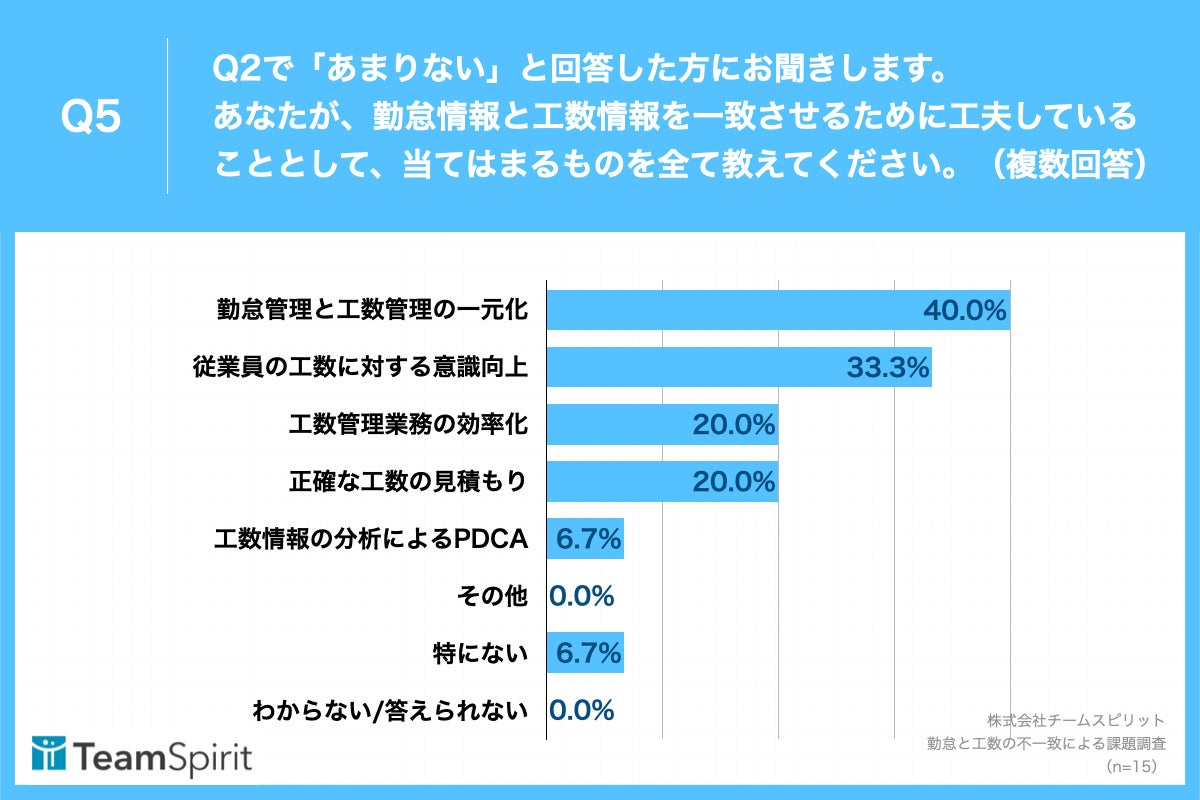 Q2で「あまりない」と回答した方に、「Q5.あなたが、勤怠情報と工数情報を一致させるために工夫していることとして、当てはまるものを全て教えてください。(複数回答)」(n=15)と質問したところ、「勤怠管理と工数管理の一元化」が40.0%、「従業員の工数に対する意識向上」が33.3%という回答となりました。