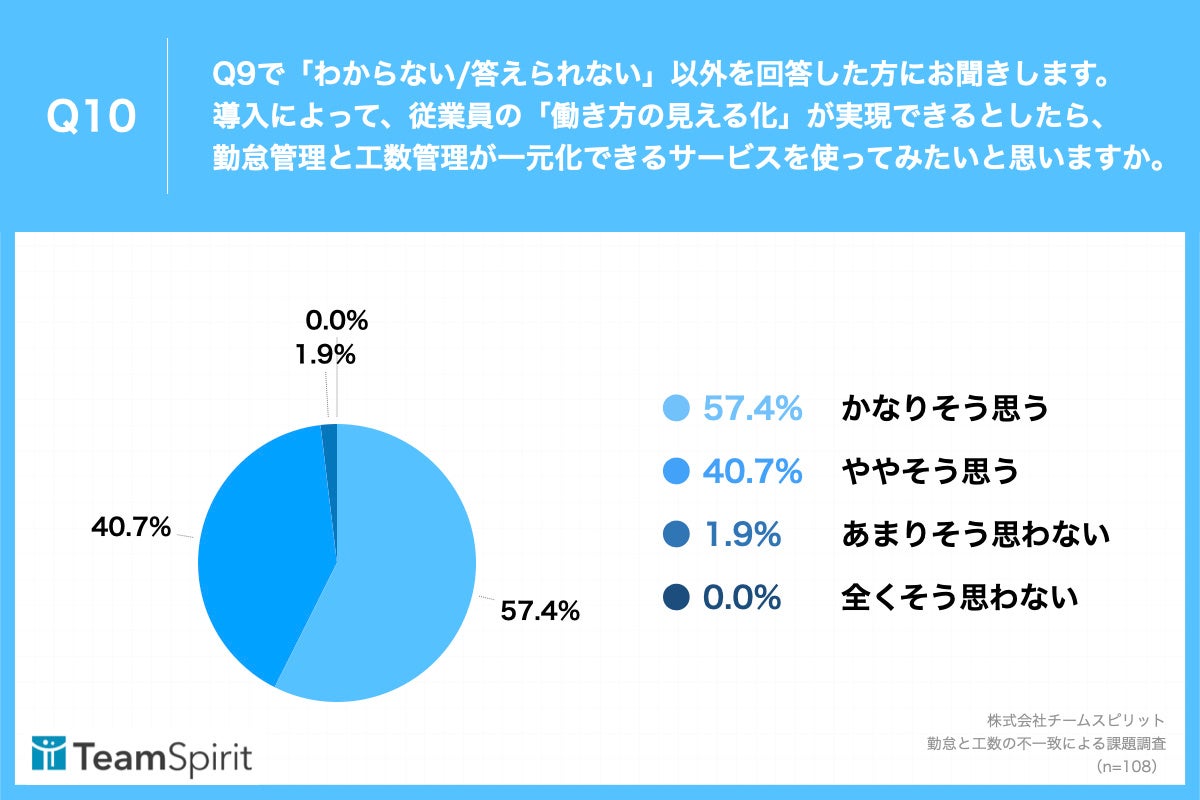 Q9で「わからない/答えられない」以外を回答した方に、「Q10.導入によって、従業員の「働き方の見える化」が実現できるとしたら、勤怠管理と工数管理が一元化できるサービスを使ってみたいと思いますか。」(n=108)と質問したところ、「かなりそう思う」が57.4%、「ややそう思う」が40.7%となり98.1%の方が勤怠管理と工数管理を一元化できるサービスに関心を示す回答となりました。