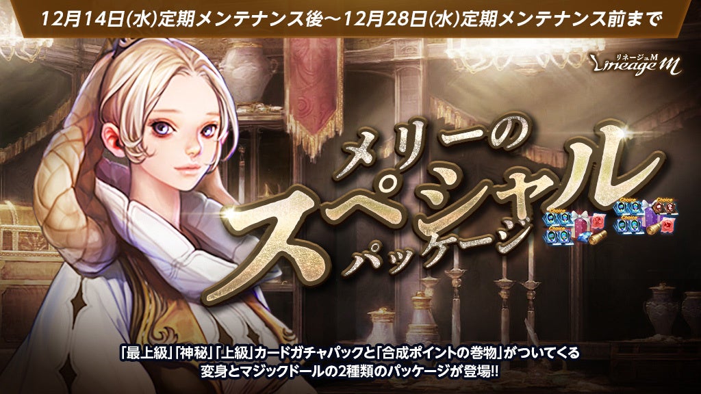 高級~伝説級の変身/マジックドールカードが獲得できる「最上級カードガチャパック選択箱」と、高級~英雄級の変身/マジックドールカードが獲得できる「神秘のカードガチャパック選択箱」と一緒に、合成累積報酬のポイントが+1される「変身/マジックドールカード合成ポイントの巻物(希少>英雄)」や、一般~英雄級の変身/マジックドールカードが獲得できる「上級カードガチャパック選択箱」、アインハザードの祝福を100上昇させる「ドラゴンのダイヤモンド」がセットになった「メリーのスペシャルパッケージ」が登場しました。