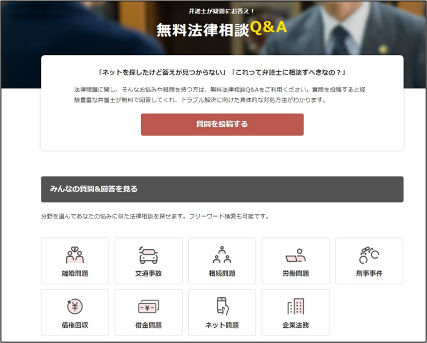 「弁護士ナビシリーズ」では、2021年9月に“無料法律相談Q&A”を実装いたしました。本機能は、ユーザーが無料会員登録をすることで、身近な法律トラブルについて、スマホやPCから気軽に質問を投稿し、「弁護士ナビ」に掲載中の法律事務所所属の弁護士から回答が得られるものとなります。