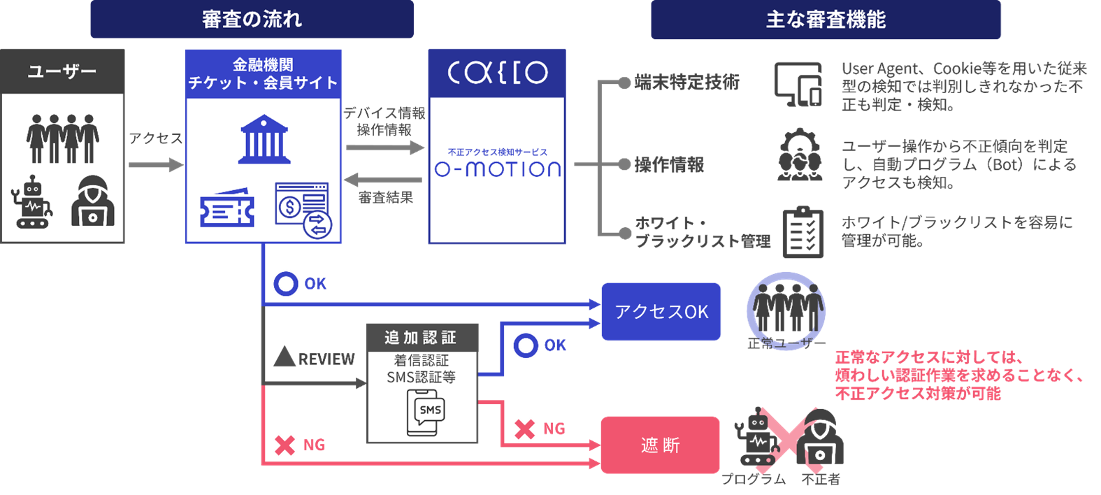 「O-MOTION」は、特許を取得した独自の端末特定技術とキータッチなどの操作情報の活用により、正しいID・パスワードによるアクセスであっても、そのアクセスが本当に本人によるものであるのか、不正者による不正アクセスなのかをリアルタイムに検知するクラウドサービスです。自動プログラム(Bot)による総当たり攻撃や他人のID・パスワードを使った不正者のなりすましを検知し、通販サイト、金融サービスサイト(インターネットバンキング・ネット証券)、会員サイト等において、不正アクセス/不正ログイン対策にご利用いただいております。