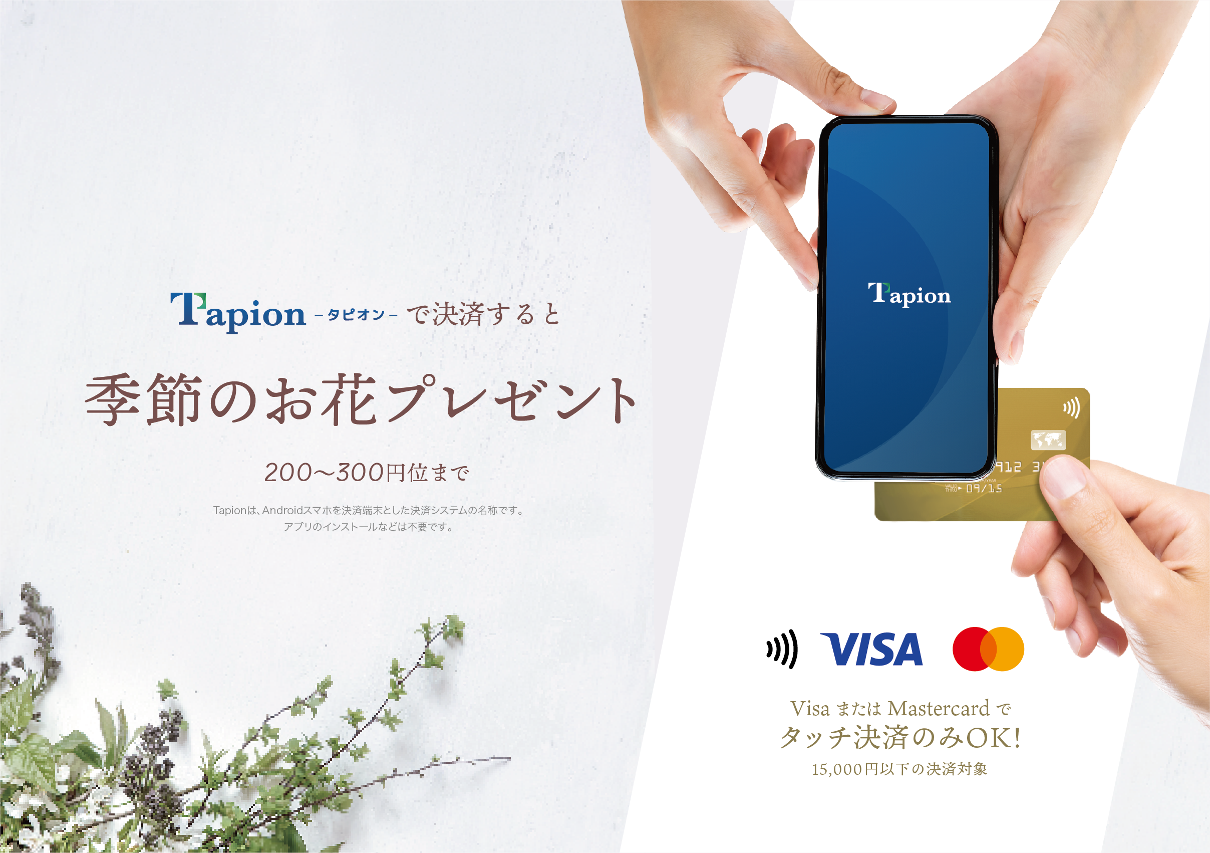 なお当社では、生花店・キッチンカーなどは、配達先での出先決済の必要性、端末の防水性など、決済専用端末ではなくスマートフォンの特徴を活かしたタッチ決済ととても親和性が高い業態と考えており、今回のパイロット第二弾の運用を通じ、今後の本格展開に向け機能改善を行なっていく予定です。また引き続き当社では、Tapionプラチナバージョンでのパイロット運用を別加盟店でも実施予定で、「Tapion」によるキャッシュレス決済、及びタッチ決済の普及拡大に努めて参ります。