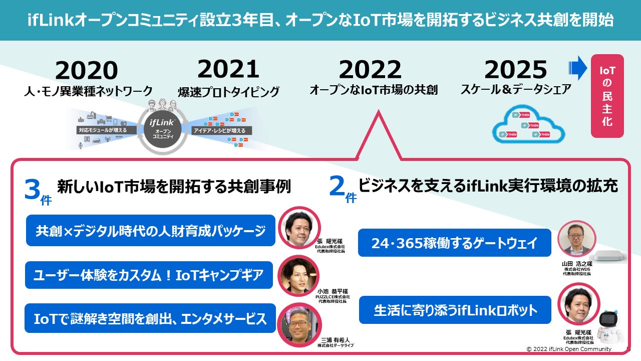 「誰もがカンタンにIoTを使える世界」の実現を目指す「一般社団法人ifLinkオープンコミュニティ」(代表理事 岡田俊輔)は、12月21日(水)14時から17時30分にて、東北・関東・中部・近畿・九州の5拠点+オンラインにて「ifLink Open Community Festival 2022」を開催します。イベントにて、新しいIoT市場を開拓する『ユーザー体験をカスタム!IoTキャンプギア』、『共創×デジタル時代の人材育成パッケージ』、『IoTで謎解き空間を創出、エンタメサービス』、 IoTプラットフォーム“ifLink”を搭載するロボットやゲートウェイ等の実行環境の拡充など、オープンイノベーションの実践集団が生み出すifLinkを利用したビジネス共創事例を発表します。本イベントはifLinkオープンコミュニティで生まれた様々なコラボレーション活動の成果を発信することを目的としています。