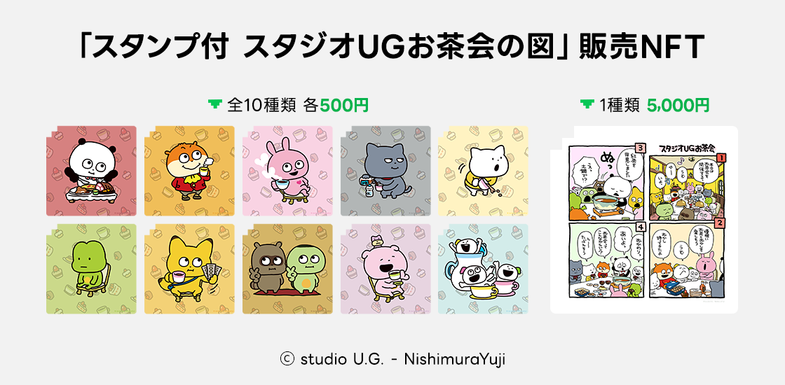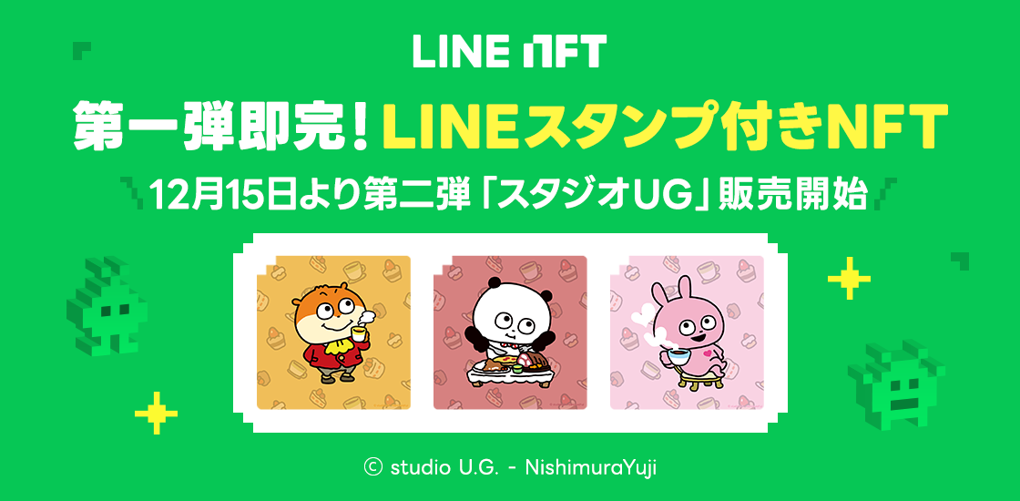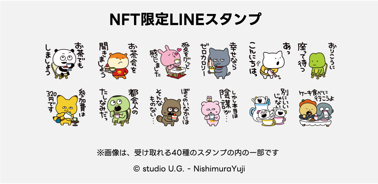 このたび、第二弾「LINE スタンプ付き NFT」として人気クリエイター「にしむらゆうじ」さんが特別に描き下ろした「ごきげんぱんだ」や「こねずみ」、「ラブラビット」などの人気キャラクターが集う「スタジオ UG」のNFTを12月15日(木)11時より販売いたします。さらにNFT保有後に楽しめるNFT限定LINEスタンプとして、家族や友だちとの日常のコミュニケーションのなかで使えるLINEスタンプを全40種類用意しております。
