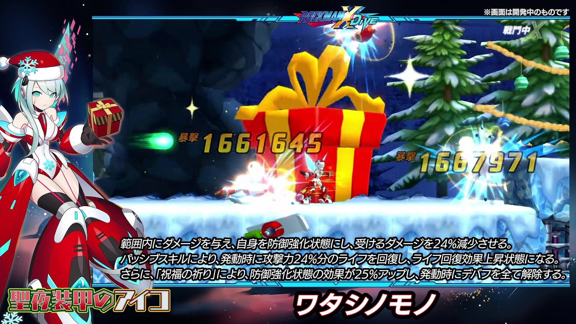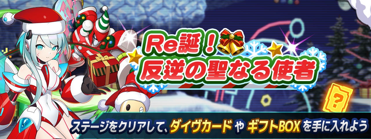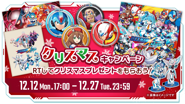 12月27日(火)23:59まで「クリスマスキャンペーン」を開催!「ロックマンX DiVE」公式ツイッター(@RX_DiVE)をフォローし、 キャンペーン期間中にハッシュタグ「#ロックマンXDiVEクリスマス」が付いたツイートをRTした方から抽選で50名様に 「ロックマンXDiVE オリジナルノベルティグッズ」をプレゼントします。