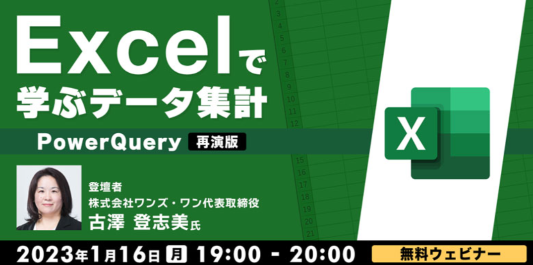 今回のセミナーで講師を務めるのは、PC&IT講師として20年以上の経歴を持つ株式会社ワンズ・ワン代表取締役の古澤登志美氏です。皆さまには、外部データの取込み・変換・整形・加工ができるExcelの機能である“PowerQuery”について、ハンズオン形式で学んでいきます。事務職からデータ領域へ転職を検討されている方などに特におすすめの内容です。ご興味をお持ちの方は、ぜひご参加ください。