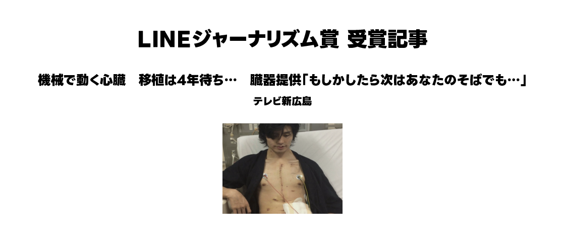 今年も、元TBS報道キャスターで⽩鴎⼤学特任教授の下村健⼀⽒、東京工業大学リベラルアーツ研究教育院准教授の治部れんげ氏、ウェブメディア「DANRO」編集長で関西大学総合情報学部特任教授の亀松太郎氏、NPO法人自殺対策支援センターライフリンク代表の清水康之氏に加えて、キャスターでありジャーナリストの長野智子氏、一般社団法人SDGs in SPORTS代表理事の井本奈保子氏を特別アドバイザーに迎えた「LINEジャーナリズム賞」は、テレビ新広島報道部・石井百恵氏の『機械で動く心臓 移植は4年待ち… 臓器提供「もしかしたら次はあなたのそばでも…」』が受賞いたしました。
