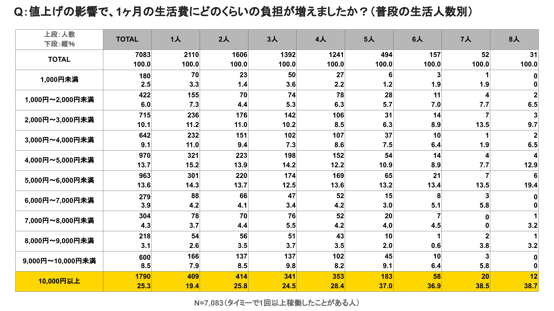 - 値上げの影響により、1ヶ月の生活費が10,000円以上が増えたと回答した人は25.3%で、前回の調査結果から6.2ポイント増加し、初めて20%を超えた。