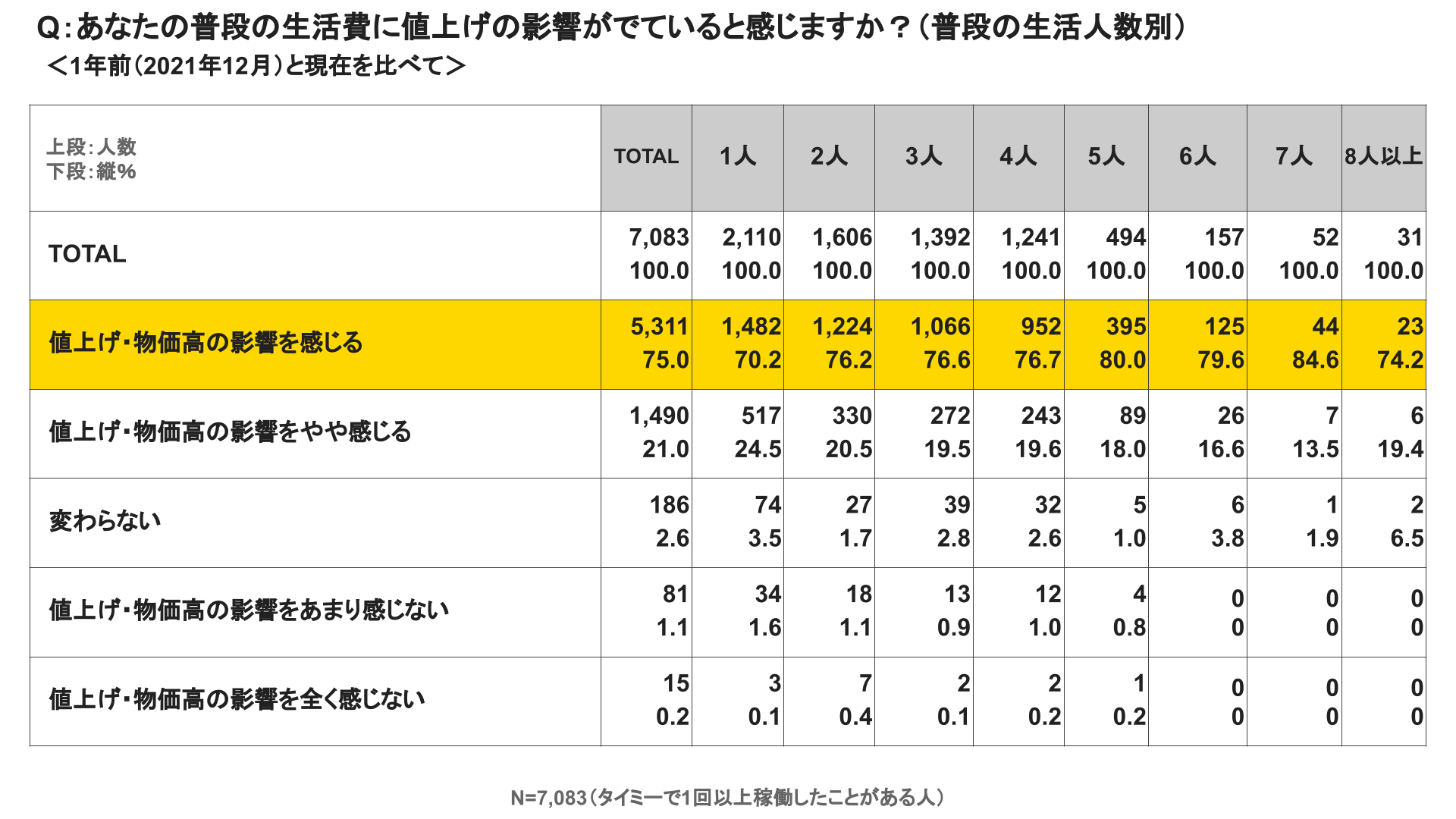 なお、生活している人数が多い世帯ほど、値上げ・物価高の影響を感じる割合が高い傾向が確認された。
