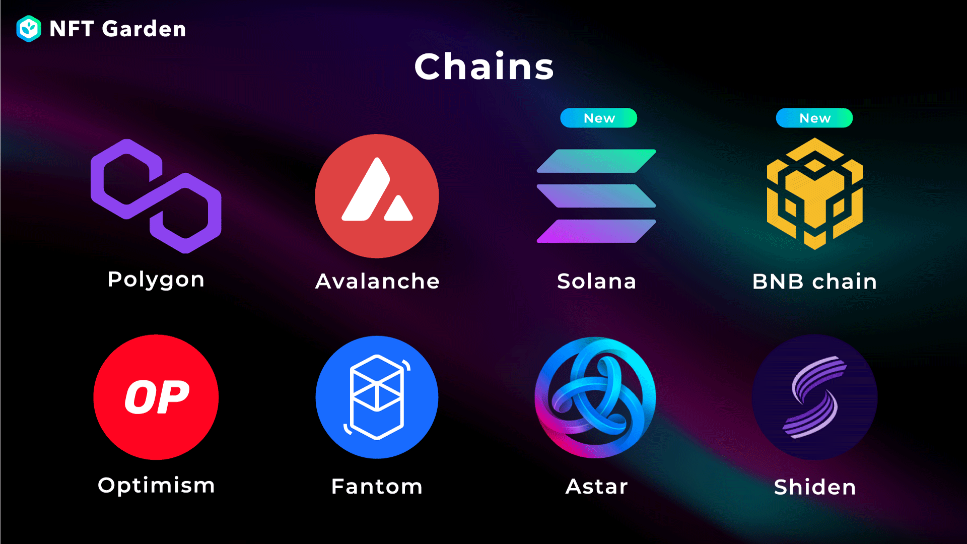 NFT Gardenではこれまで『Polygon』や『Avalanche』『Optimism』など6種のチェーン、11のネットワークでのNFT生成に対応しておりましたが、今回のアップデートにて、L1チェーンである『Solana』と『BNB chain』のNFT生成に対応いたしました。今後、NFT生成に使用できるチェーンは8種類、15のネットワークとなり、Web画面・API双方からの実施が可能となります。