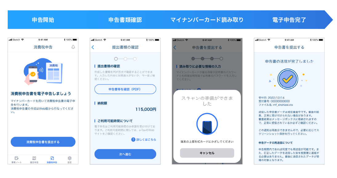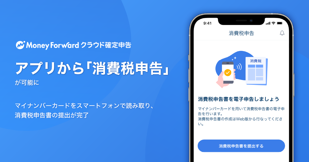 今回新たに、「消費税申告機能」で作成した消費税申告書の提出の手間を削減するため、スマホアプリから消費税申告書の電子申告ができるようになりました。マイナンバーカードをNFC対応スマホから読み込むことで、『マネーフォワード クラウド』内で消費税申告が書類提出まで完結できるようになります。