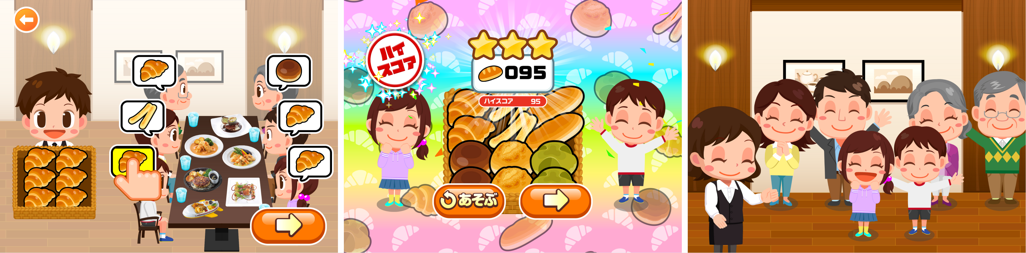 お客さまが食べたいと思っている焼きたてのパンを配ることができると、お客さまが笑顔になり、ポイントがもらえます。制限時間内にたくさんの焼きたてパンを配り、ハイスコアを目指します。
