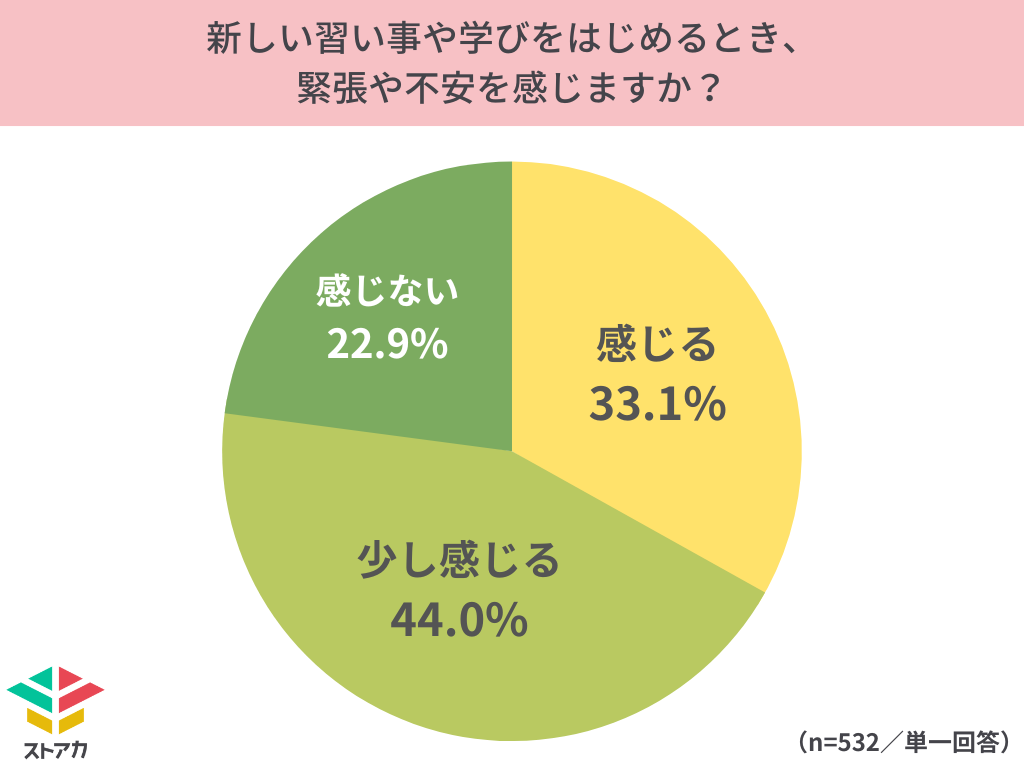 新しい習い事や学びをはじめるとき、緊張や不安を感じるか聞いたところ、「感じる/少し感じる」と答えた人が77.1%と約8割という結果に。大人であっても、新しいことに挑戦するときには、緊張したり不安を感じてしまうようです。