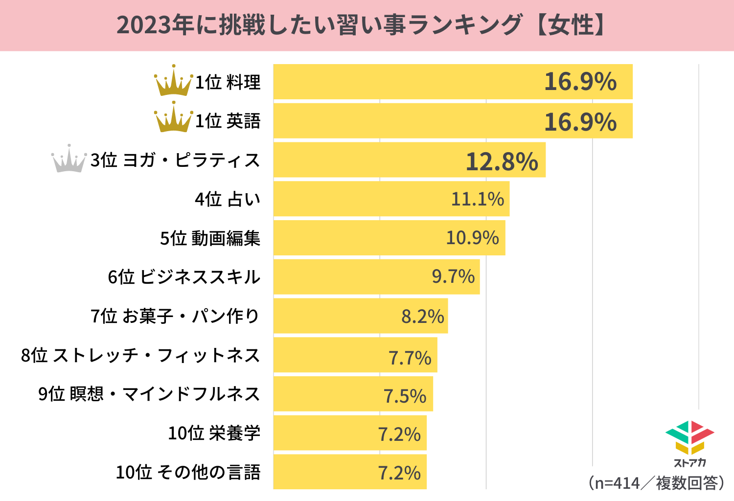 - 大人の女性が2023年に挑戦したい習い事、1位「料理」「英語」、3位「ヨガ・ピラティス」。美味しい・節約・自分と家族の健康もキープできるという、一石三鳥の「料理」への高い人気は、2023年も続きそう。