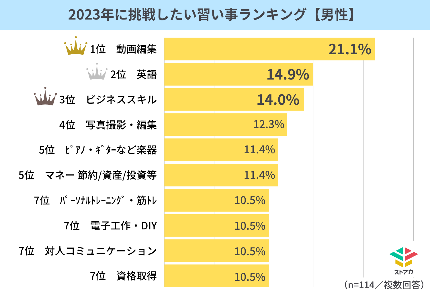 - 大人の男性が2023年に挑戦したい習い事、1位「動画編集」、2位「英語」、3位「ビジネススキル」。