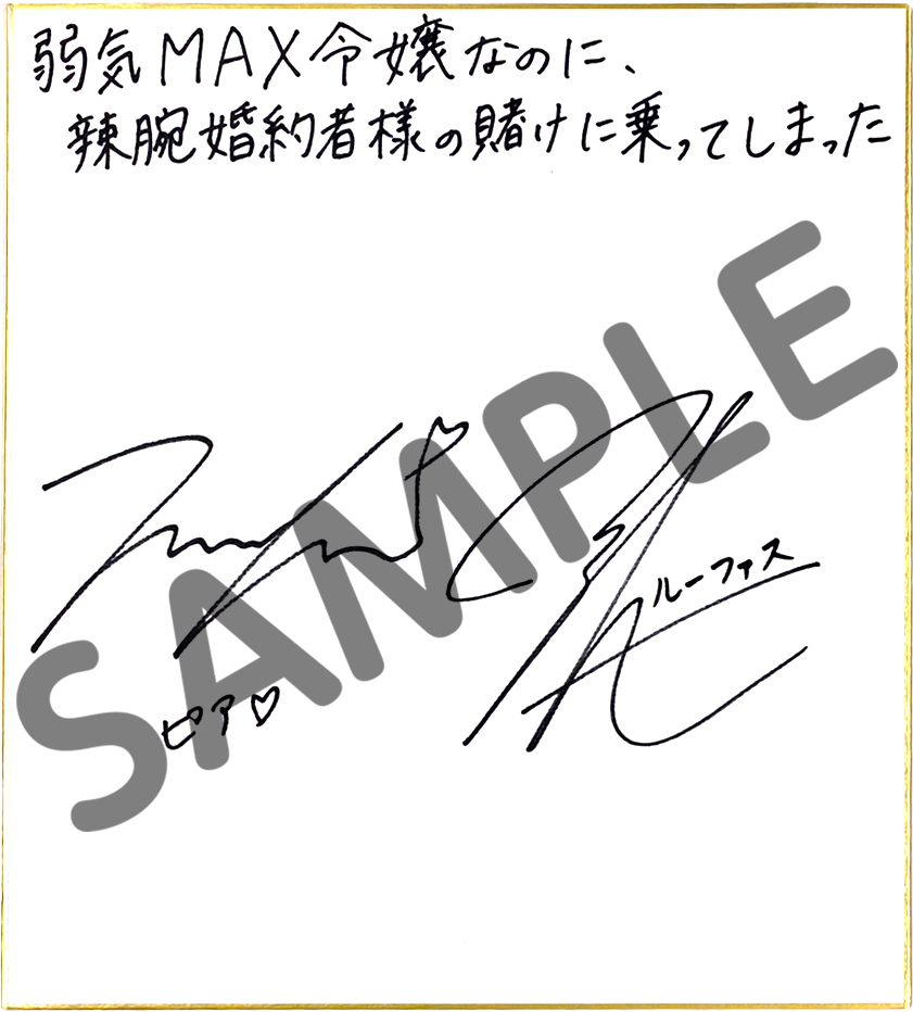 対象期間中に『弱気MAX令嬢なのに、辣腕婚約者様の賭けに乗ってしまった ~辣腕婚約者様は、突然の来客に容赦ない~』をご購入いただき、プラットフォーム内のプレゼントキャンペーンページにてエントリーされたお客様の中から、抽選で2名様に「出演声優陣(伊藤美来さん/逢坂良太さん)による直筆サイン色紙」をプレゼントいたします。