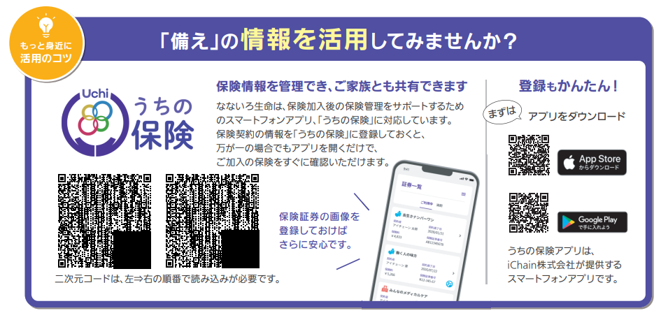 保険の契約者がうちの保険に保険情報を簡単に登録、管理できるよう、なないろ生命とはなさく生命には、うちの保険専用のQRコードを各社の保険証券など一部の通知物に掲載頂きます。契約者がスマートフォンでQRコードを読み取ると、保険証券番号などを手入力せずに即時で簡単にデータを登録できます。