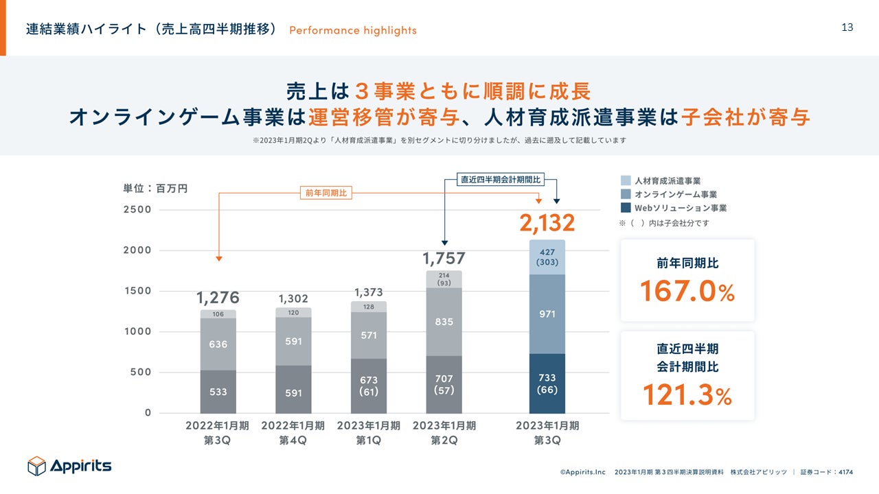 Webソリューション事業は、前年同四半期・直近四半期との比較で堅調に推移し、市場環境も引き続き活況です。またオンラインゲーム事業においては、『ユニゾンエアー』のイベント等で売上は大きく伸長。さらに第2四半期に新たにセグメンテーションした人材育成派遣事業は、子会社が寄与して大きく成長しました。