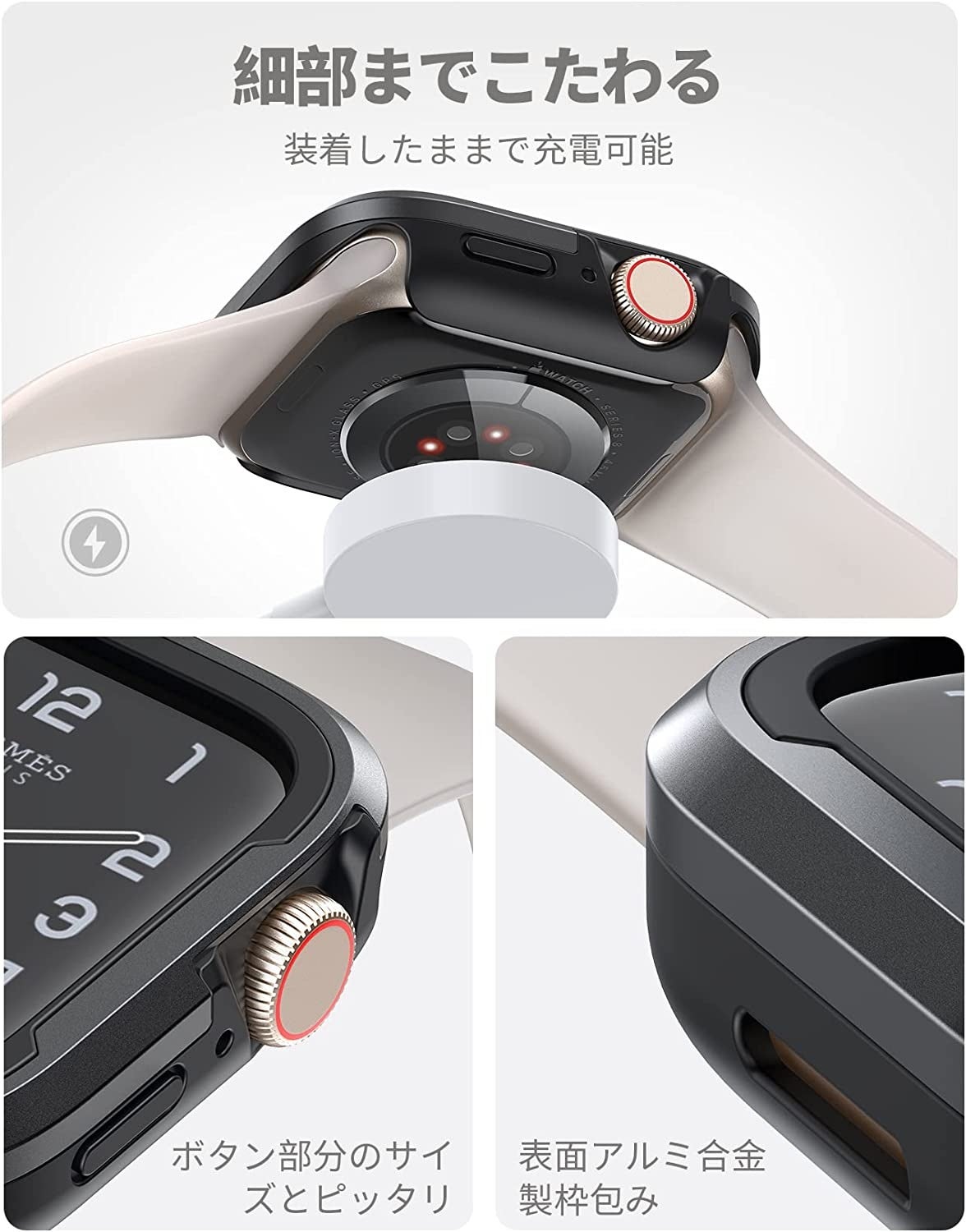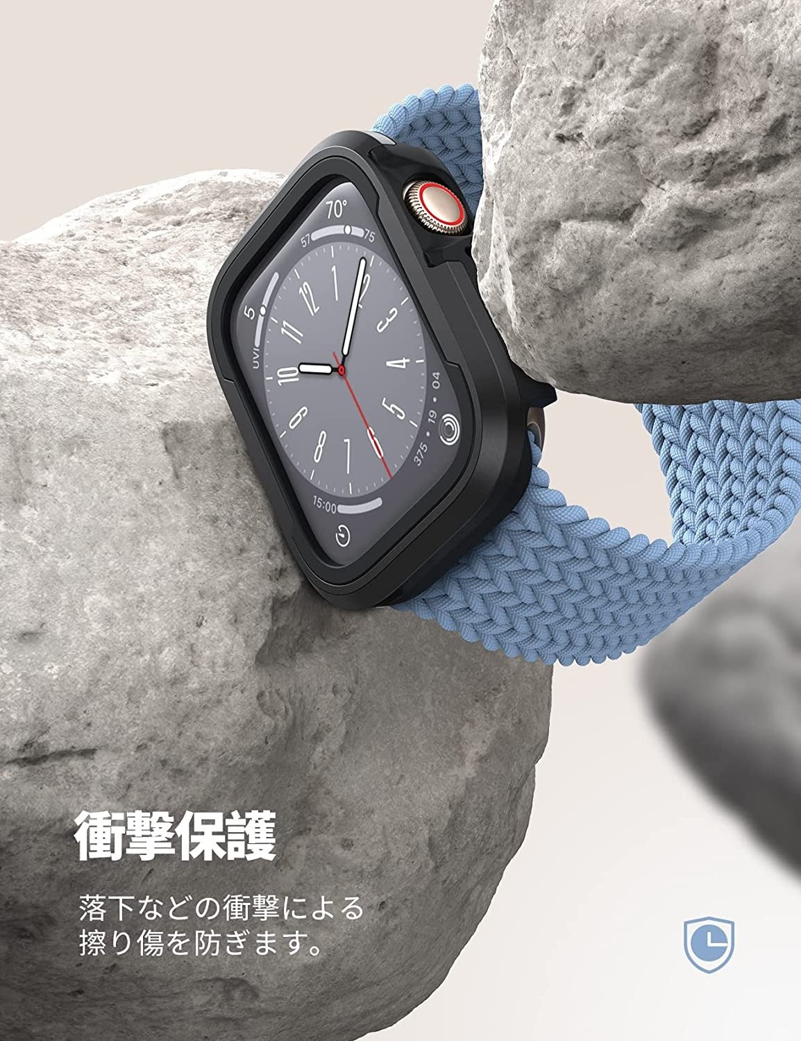 自動販売機に、電子決済端末に、画面部分をかざすことの多いApple Watch。Lamicallではアルミニウム合金製フレームが画面を包み込み、側面からの衝撃を吸収するデザインを採用しました。誤って勢いよくセンサー端末にかざしてしまっても、高めに作られたフレームが全方向の衝撃からしっかり画面を保護します。