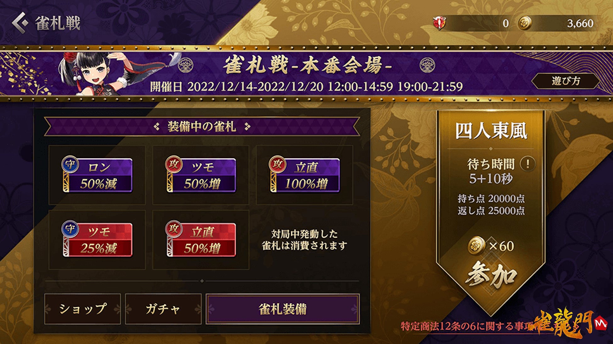 「雀札戦無料チケット」を使って、「雀札戦」に挑戦してみましょう!