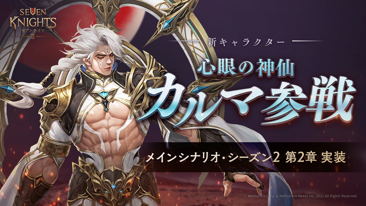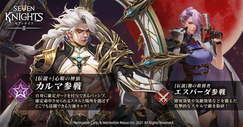 『セブンナイツ2』の世界に新たな英雄として伝説+「心眼の神仙 カルマ(CV.小西克幸)」と伝説「闇の救援者 エスパーダ(CV.池永亜美)」が参戦いたします。旧四皇「心眼の神仙 カルマ」は範囲内の敵への強力な攻撃や、味方全員へのシールド効果など、攻守に活躍するスキルを持つ万能型の英雄です。「闇の救援者 エスパーダ」は敵への特大ダメージに加え、即死や転倒、気絶などの効果を与えるスキルを持つ攻撃型の英雄です。