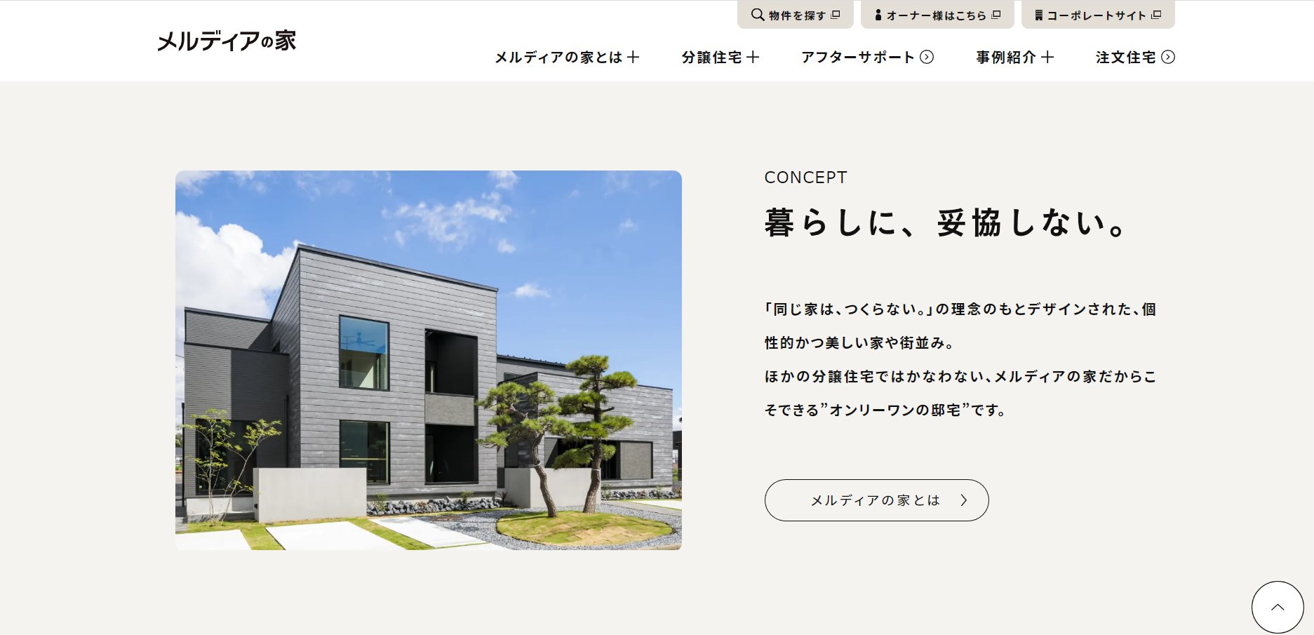 「同じ家は、つくらない。」の理念のもとデザインされた、個性的かつ美しい家や街並みを目指し、ほかの分譲住宅ではかなわない、メルディアの家だからこそできる、“オンリーワンの邸宅”をこれからも、お客様の声に寄り添ってつくっていくという思いを込めたコンセプトに一新いたしました。