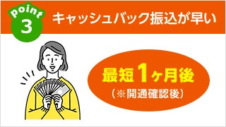 キャッシュバックが早い!!なんと≪最短1ヶ月後には、指定の口座へ現金をお振込》いたします♪