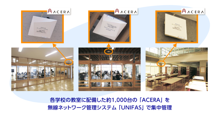 市内合計45校、約750クラスの普通教室と体育館等を含む特別教室にアクセスポイントを設置してネットワークを構築しており、統合的に管理運用する手段が求められました。無線ネットワーク管理システム 「UNIFAS (ユニファス)」 を導入することで、トータル1,000台規模のACERAを集中管理することが可能になりました。