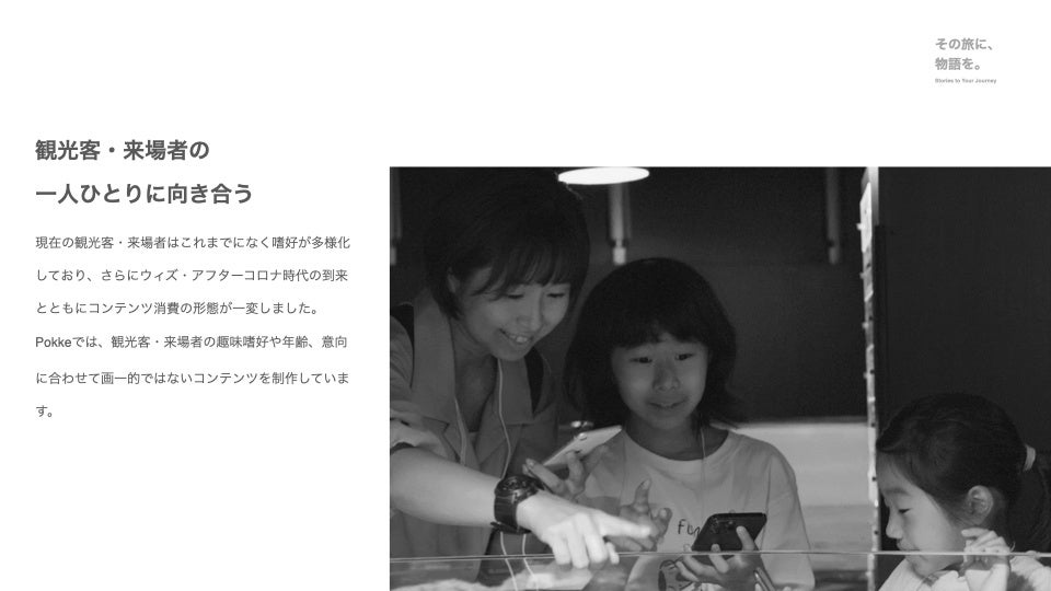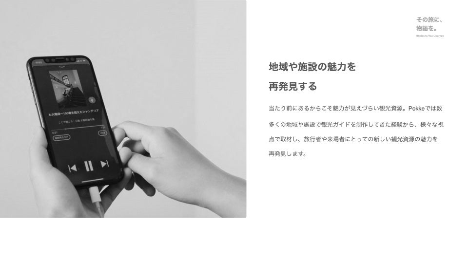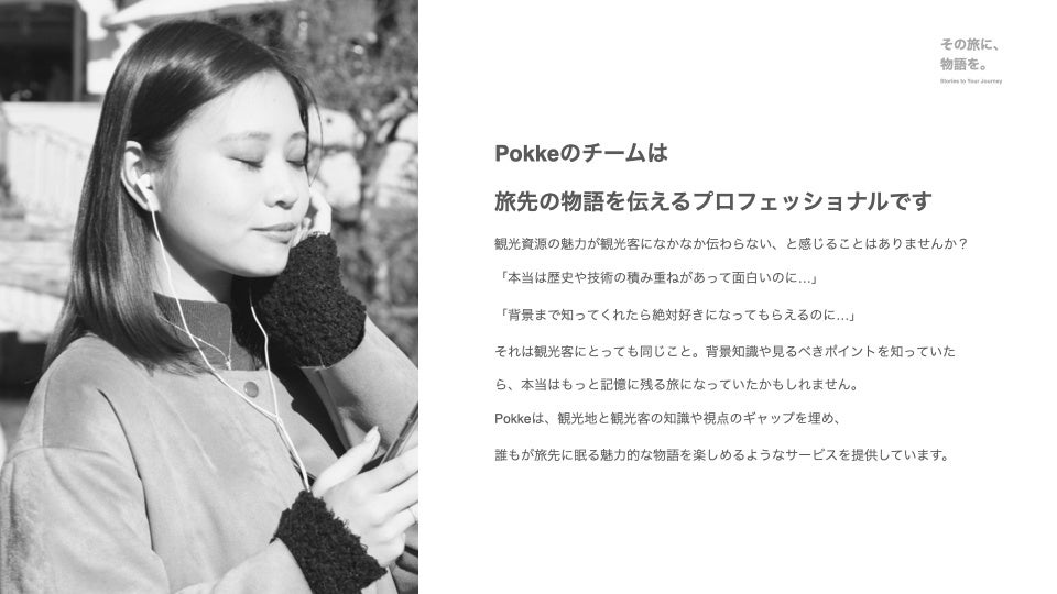 Pokkeは「旅先の物語を届ける」をコンセプトとする、旅と学びの観光DXソリューションです。美術館や博物館向けの音声ガイドや街歩き型のトラベル音声ガイドを主体としたスマートフォン・WEBアプリとして展開しています。