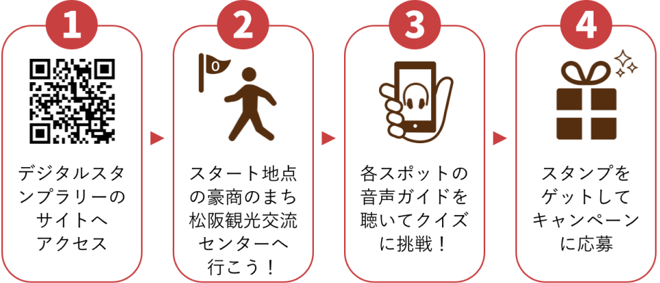 松阪観光を楽しみながら、松阪市内の13スポットを巡り、各スポットの音声ガイドを聴いてクイズに挑戦!正解するとスタンプをGET。スタンプを6個以上集めると松阪市の特産品「松阪牛」などが当たるプレゼントキャンペーンに応募できます。