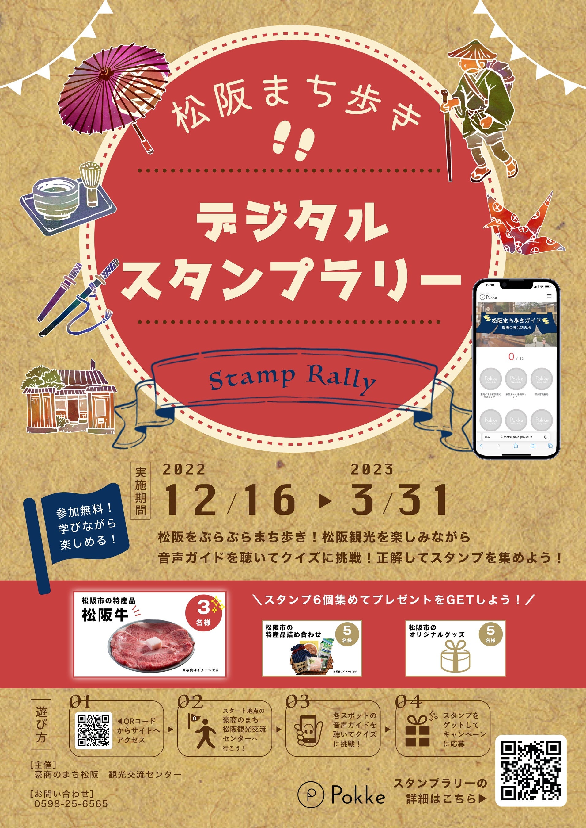 さらに、音声ガイドとスタンプラリーが一体化していることが特徴の「Pokkeデジタルスタンプラリー」を活用した「松阪まち歩きデジタルスタンプラリー」を12月16日よりリリースしました。
