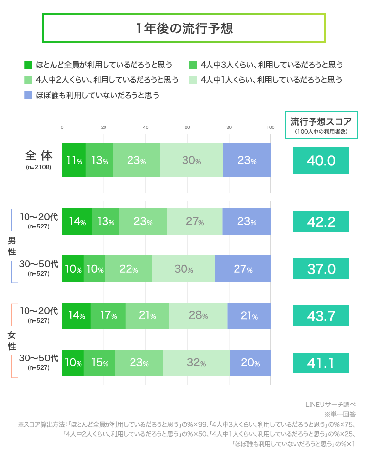 次に、「1年後、自分のまわりでどのくらいの人が利用していると思うか」を想像して答えてもらいました。グラフにある流行予想スコアは、100人中どのくらいの人が1年後に利用していそうかを算出した数値です。