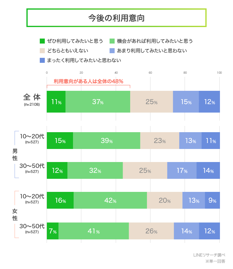 次に、今後の利用の意向について回答してもらったところ、利用意向がある人の割合(「ぜひ利用してみたいと思う」「機会があれば利用してみたいと思う」の合計)は全体で48%となりました。