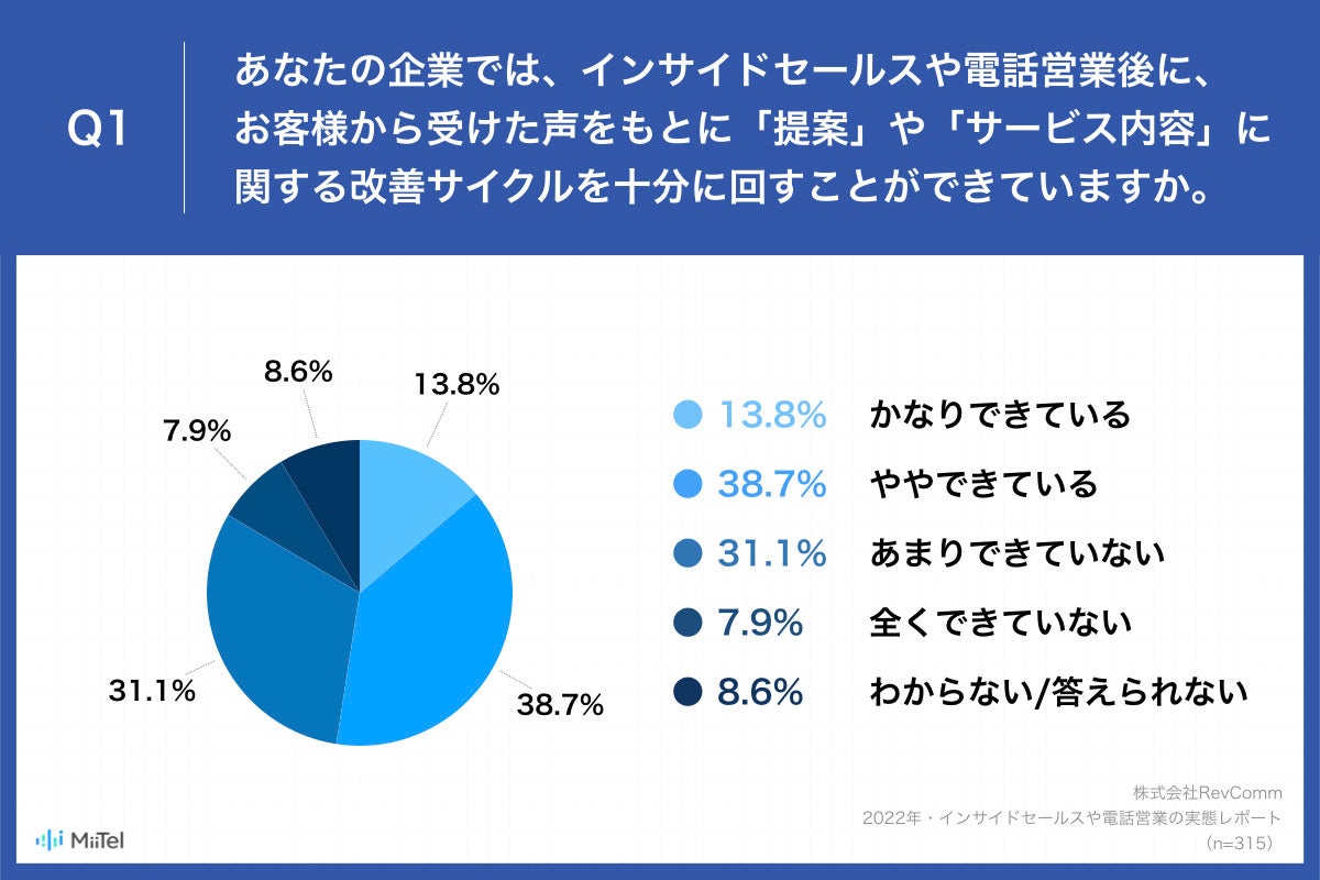 「Q1.あなたの企業では、インサイドセールスや電話営業後に、お客様から受けた声をもとに「提案」や「サービス内容」に関する改善サイクルを十分に回すことができていますか。」(n=315)と質問したところ、「あまりできていない」が31.1%、「全くできていない」が7.9%という回答となりました。