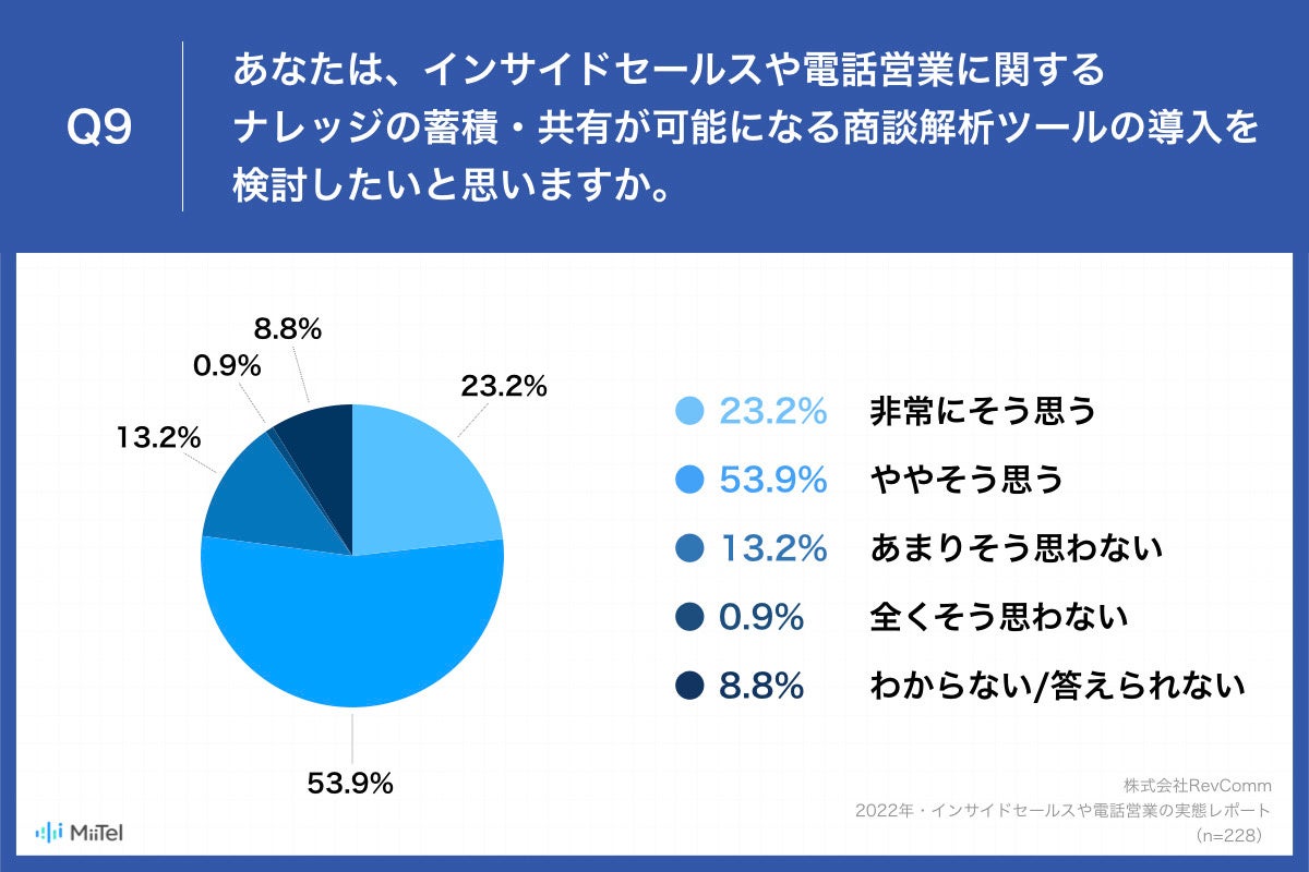 Q7で「非常にそう思う」「ややそう思う」と回答した方に、「Q9.あなたは、インサイドセールスや電話営業に関するナレッジの蓄積・共有が可能になる商談解析ツールの導入を検討したいと思いますか。」(n=228)と質問したところ、「非常にそう思う」が23.2%、「ややそう思う」が53.9%という回答となりました。