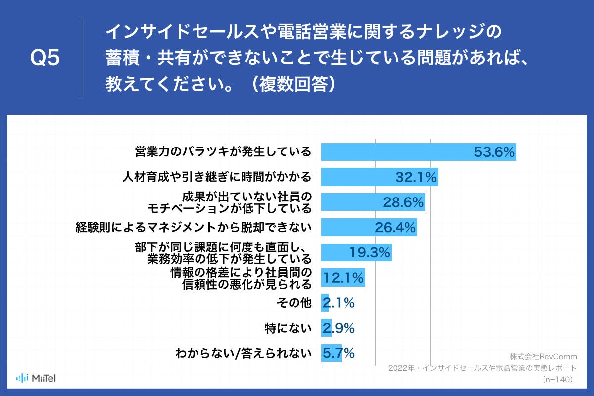Q3で「あまりできていない」「全くできていない」と回答した方に、「Q5.インサイドセールスや電話営業に関するナレッジの蓄積・共有ができないことで生じている問題があれば、教えてください。(複数回答)」(n=140)と質問したところ、「営業力のバラツキが発生している」が53.6%、「人材育成や引き継ぎに時間がかかる」が32.1%、「成果が出ていない社員のモチベーションが低下している」が28.6%という回答となりました。
