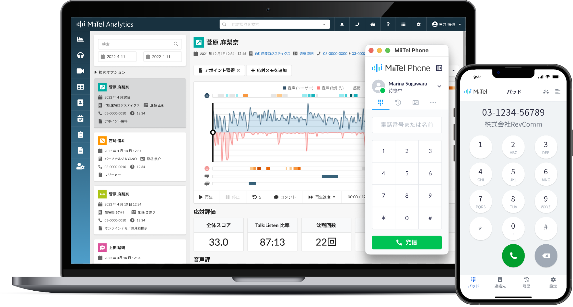 音声解析AI電話「MiiTel」は、インサイドセールス市場を中心に、営業やコールセンター業務におけるトークの可視化とセルフコーチング、リモートワーク体制構築にご活用いただいています。また、オンライン商談ツール「MiiTel for Zoom」は、複数人でのオンライン商談の解析や振り返りが可能となり、営業の成約率を飛躍させます。