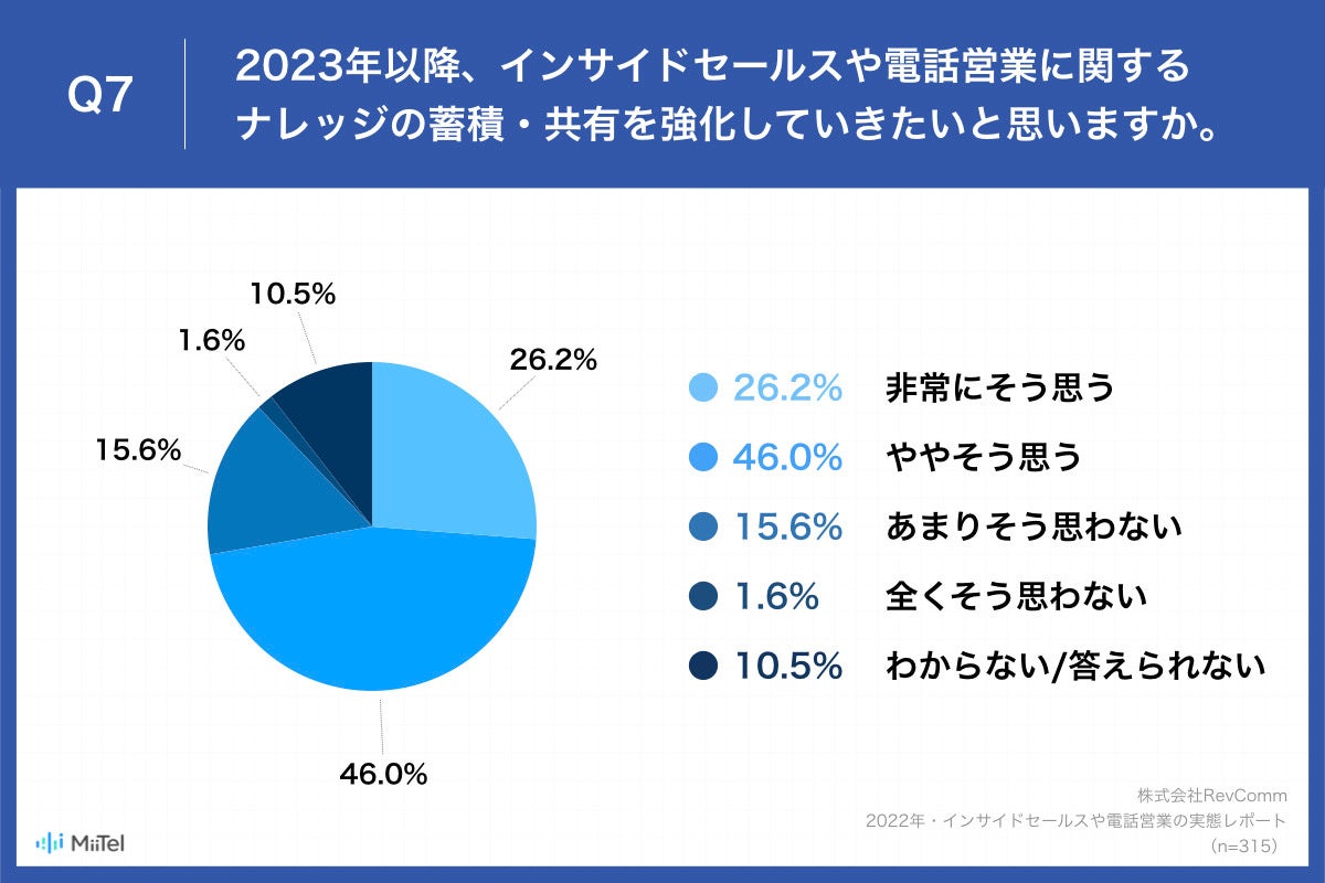 「Q7.2023年以降、インサイドセールスや電話営業に関するナレッジの蓄積・共有を強化していきたいと思いますか。」(n=315)と質問したところ、「非常にそう思う」が26.2%、「ややそう思う」が46.0%という回答となりました。