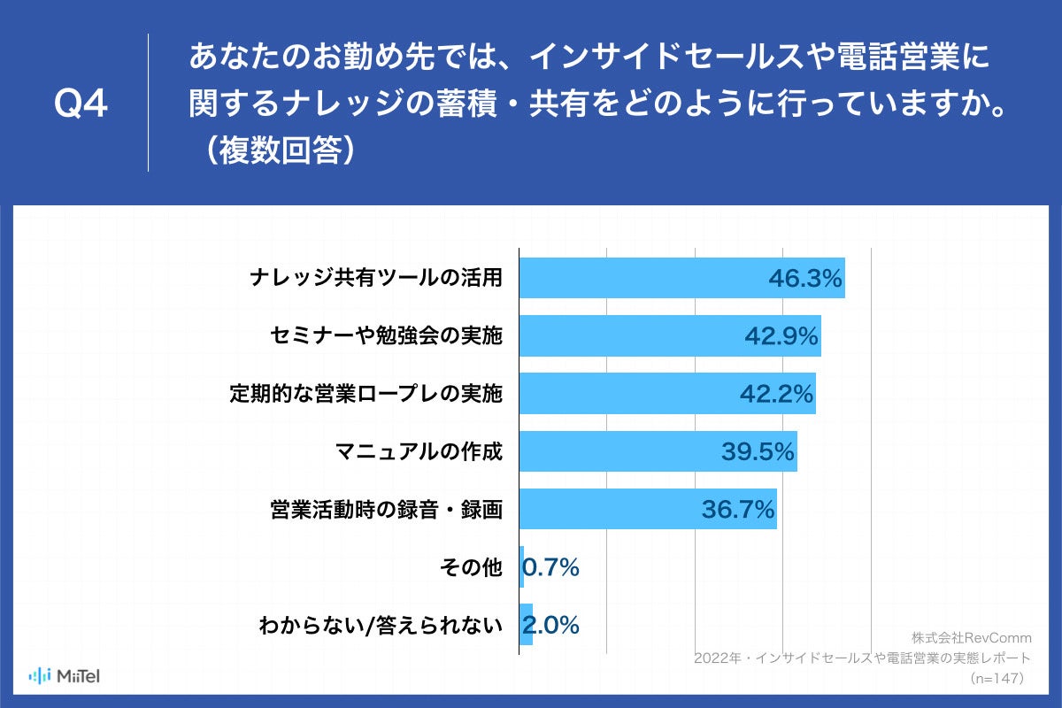 Q3で「かなりできている」「ややできている」と回答した方に、「Q4.あなたのお勤め先では、インサイドセールスや電話営業に関するナレッジの蓄積・共有をどのように行っていますか。(複数回答)」(n=147)と質問したところ、「ナレッジ共有ツールの活用」が46.3%、「セミナーや勉強会の実施」が42.9%、「定期的な営業ロープレの実施」が42.2%という回答となりました。