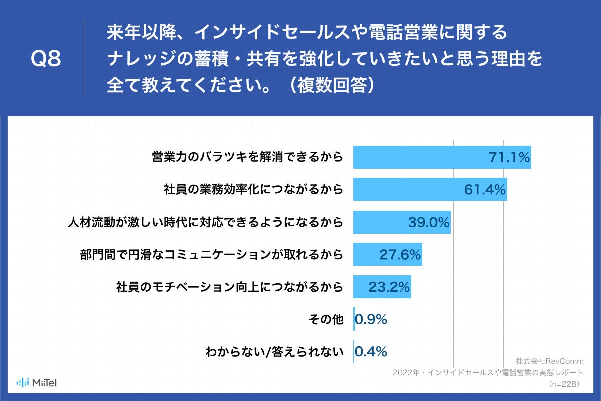 Q7で「非常にそう思う」「ややそう思う」と回答した方に、「Q8.来年以降、インサイドセールスや電話営業に関するナレッジの蓄積・共有を強化していきたいと思う理由を全て教えてください。(複数回答)」(n=228)と質問したところ、「営業力のバラツキを解消できるから」が71.1%、「社員の業務効率化につながるから」が61.4%、「人材流動が激しい時代に対応できるようになるから」が39.0%という回答となりました。